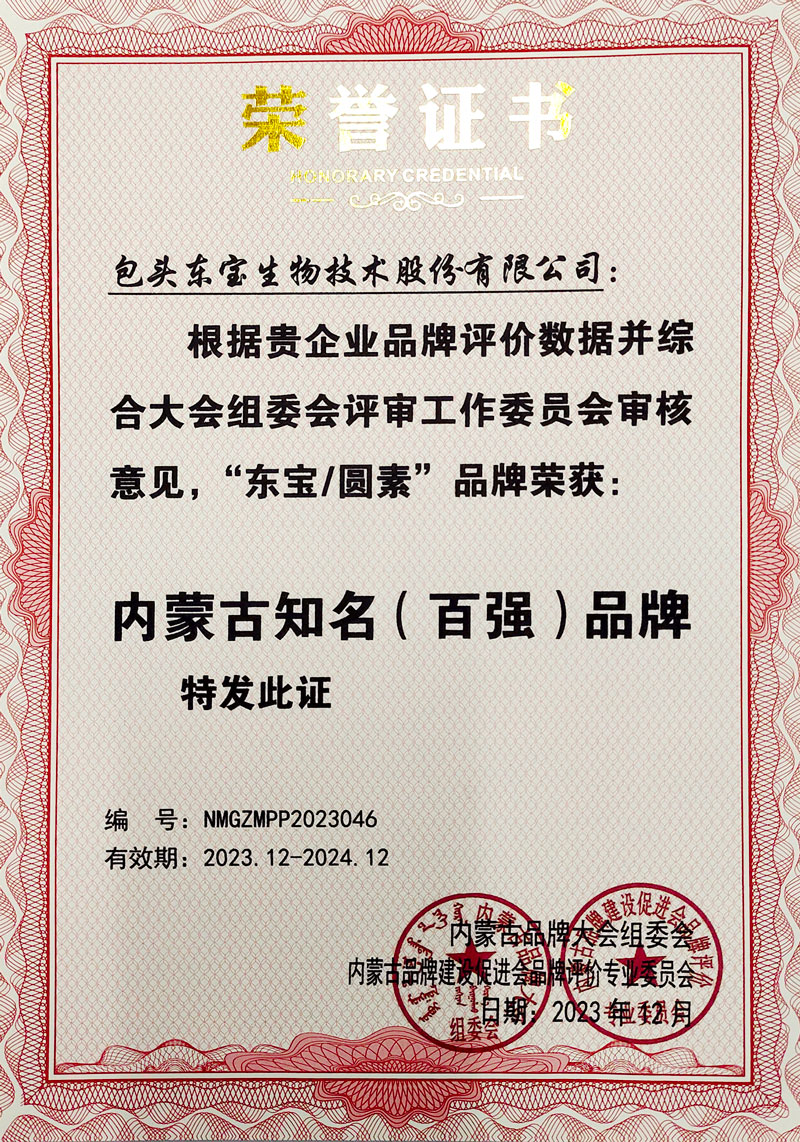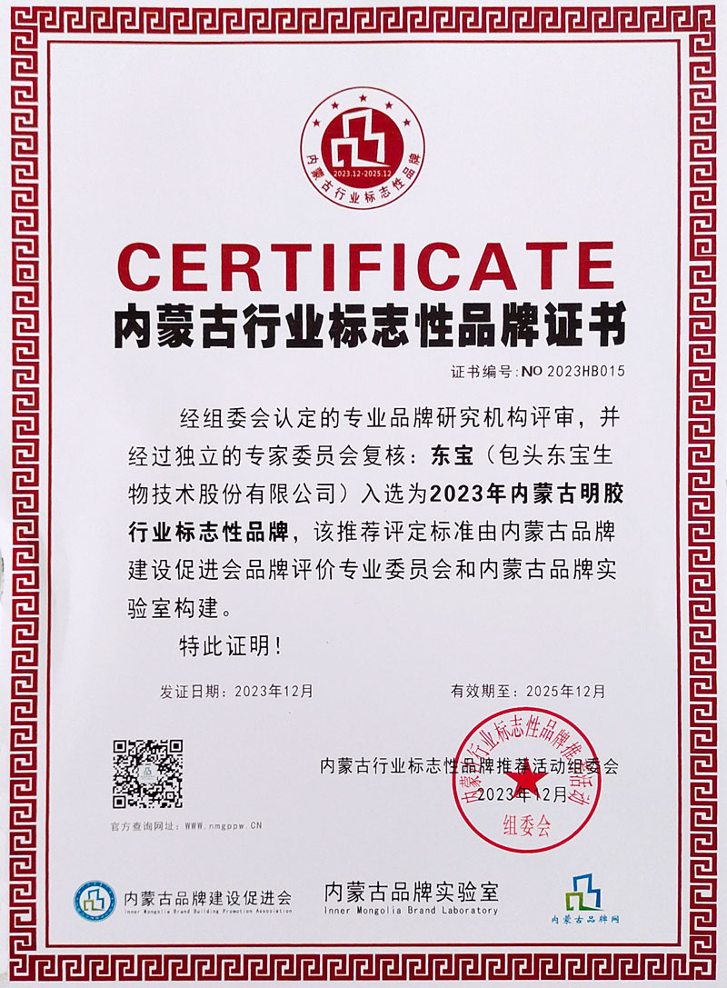 2023年12月28日,由內蒙古自治區發展和改革委員會、內蒙古自治區農牧廳指導,內蒙古品牌建設促進會主辦的第十屆內蒙古品牌大會,在呼和浩特市新城國賓北樓國宴廳隆重開幕。自治區工商業聯合會經濟部副部長和龍及各相關盟市、旗縣區政府、農牧局分管領導和市場科負責人,各高等院校特邀專家、行業商協會會長等知名區域公用品牌運營主體和企業品牌負責人等260余人參加了大會。東寶生物作為品牌代表企業參加了大會,除了品牌價值的認證評估外,大會同時也認定“東寶/圓素”為內蒙古知名(百強)品牌,公司入選為2023年內蒙古明膠行業標志性品牌企業。